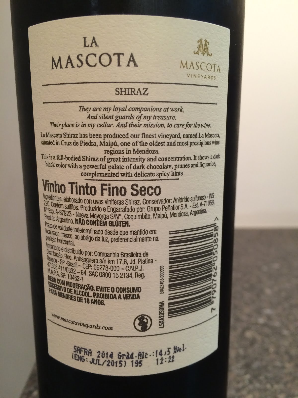 メンドーサのMASCOTA社の造るワイン。ブラジルの近所のスーパーで約2,200円(R$60)で購入した。他にも、マルベックやカベルネ・フラン、カベルネ・ソーヴィニョン等の種類があった。ブラジルで買えるアルゼンチンワインとしては比較的手頃な価格帯。